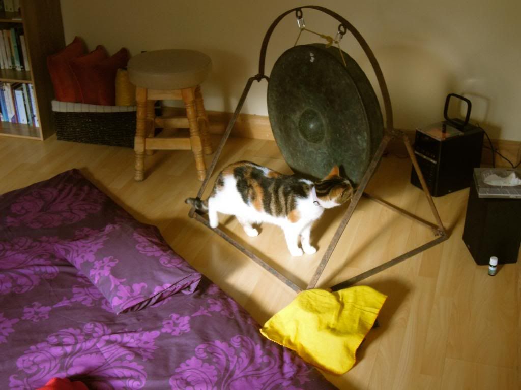 And then I realized what a great teacher she is. Every moment of anxious shock at a new noise or unexpected movement such as the gong swinging backwards and forwards was greeted with a moment's statuesque type risk assessment and then, once assured there was no danger, a few gestures of absolutely defiant composure such as licking herself or looking nonchalantly around at nothing in particular. It was a very practical example of living in the now.